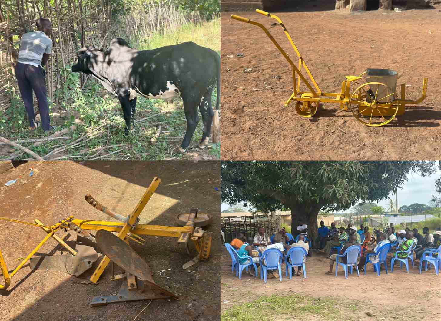 Plus spécifiquement, il s’est agi au cours de cette mission de : (1) vérifier la mise en place effective des bœufs et équipements de culture attelée (Multiculteur Arara & Arcoma, et les semoirs) , (2) vérifier la conformité des bœufs et équipement en termes de qualité et de quantité, (3) vérifier le niveau d’information du monde paysan sur le projet, et de (4) relever les difficultés rencontrées dans sa mise en œuvre.